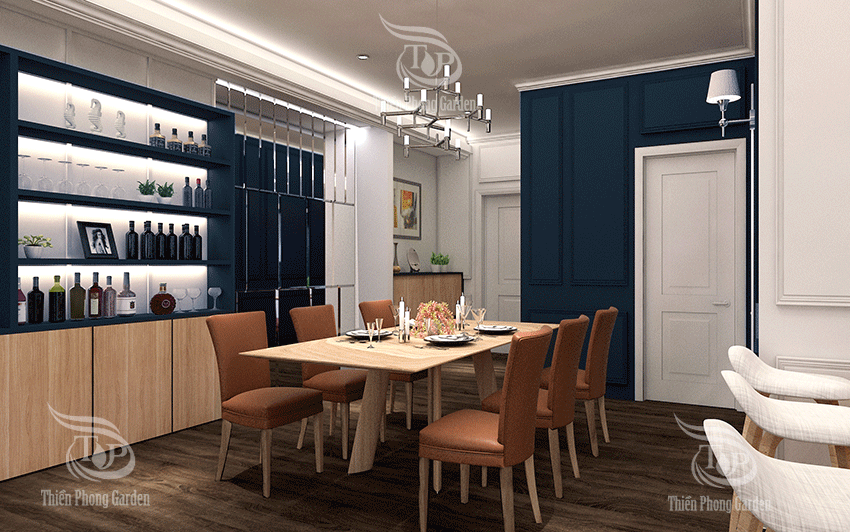 Thiết kế mang 1 chút hơi thở của bán cổ điển với các mãng tường xanh trắng chạy chỉ tiếp nối nhau. không gian mở từ phòng khách đến bếp. Khu vực bàn ăn được trang trí thêm vách kính ghép ô vát cạnh tăng thêm sự sang trọng và rộng mở.